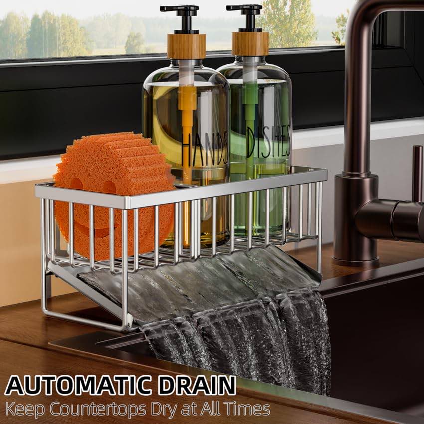 Cisily Rustproof Kitchen Sink Caddy Organizer – Sponge Holder, Soap Tray & Brush Storage in One