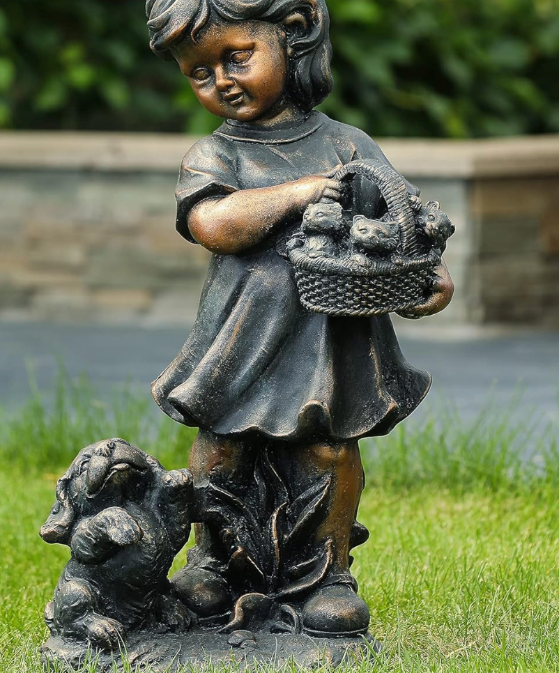 Girl Holding Basket of Kittens with Puppy Statue – A heartwarming bronze-finished piece capturing a sweet childhood moment with adorable pets.