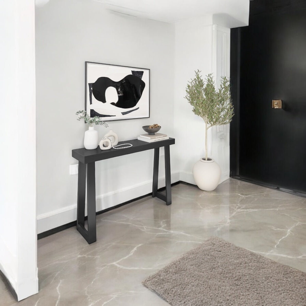 The Plank+Beam Solid Wood Console Table is a versatile and stylish piece designed for narrow spaces like entryways, hallways, or behind the couch. Measuring 46.25 inches, it provides ample space for decor, keys, or small items while maintaining a sleek, modern look. Crafted from solid wood, this durable table features easy assembly and a black finish, making it an ideal addition to living rooms, foyers, or any area that needs both function and style.