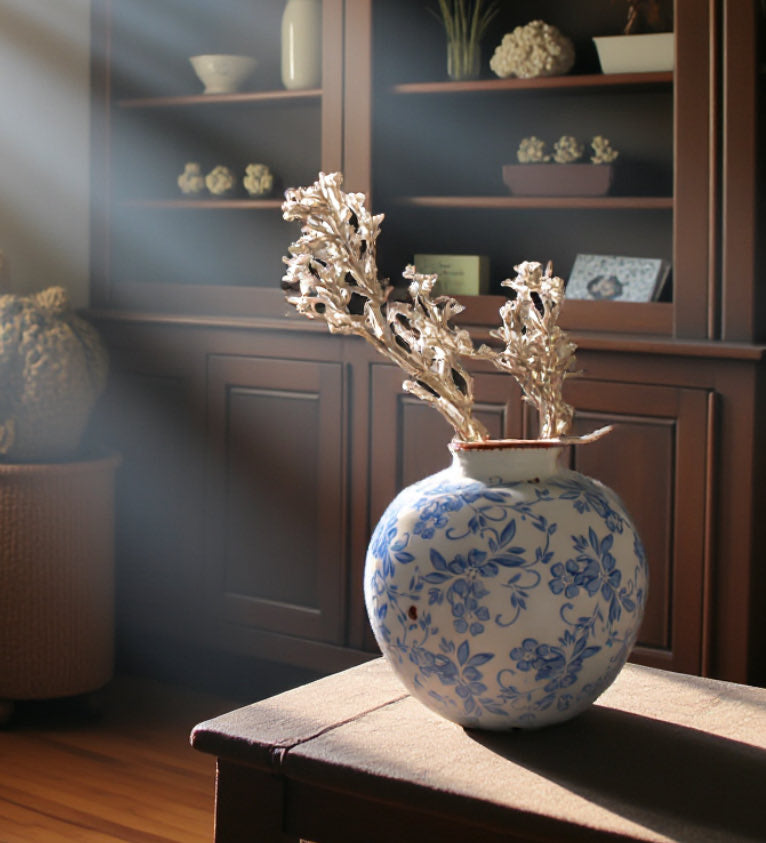 The Creative Co-Op DF2720 Terracotta Vase is a charming decorative piece featuring a blue floral transferware pattern and a crackle finish, giving it a vintage elegance. Perfect for farmhouse, cottage, or country-style decor, this 8-inch-tall vase adds a touch of color and charm to any space. Made of terracotta, it serves as both a stylish accent and a functional container for flowers or plants.