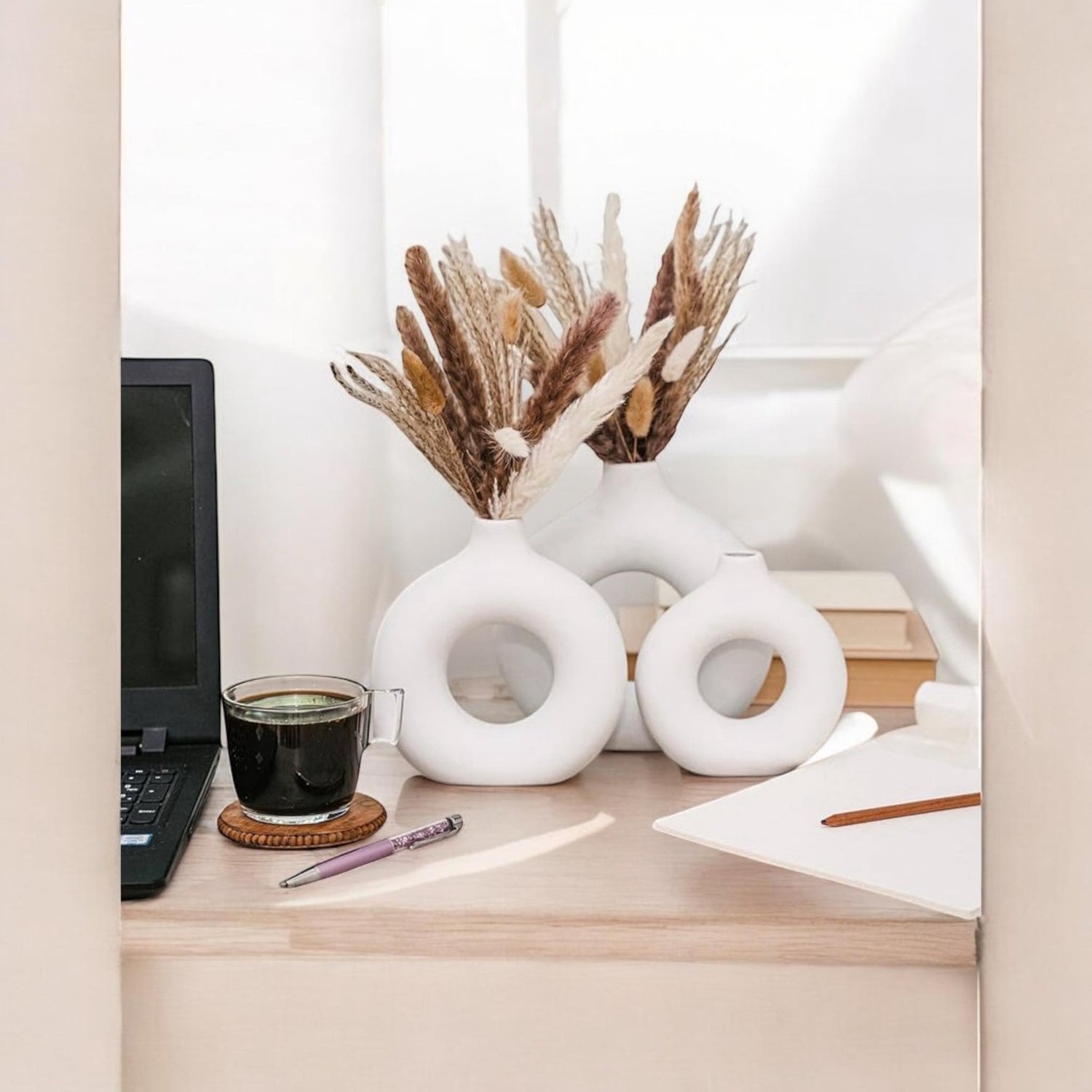 Enhance your space with this elegant boho-inspired decor. The set includes three modern white ceramic vases with a 65-piece dried pampas grass bouquet, perfect for a cozy, stylish touch. Ideal for living rooms, bedrooms, coffee tables, and offices, this low-maintenance arrangement complements any decor. A great gift for women, moms, and home decor lovers.